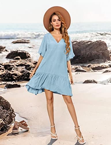 SEXY BATHING SUIT COVERUPS: This Cover ups is featuring sexy V Neckline design, to let your collarbone more charming; short ruffle sleeve is an unique spotlight; ruffle Hem made of tiered style is cut for a relaxed fit.Above-knee length cover up, it’s loose fitting and flattering.You’ll never run out on-trend choices.