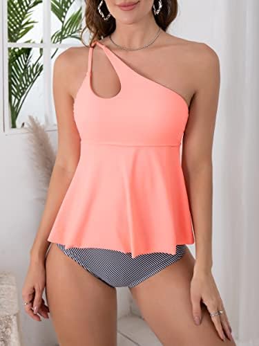2 Piece Tankini Bathing Suits for Women: This peplum tankini swimsuit designed with asymmetric cutouts on one shoulder, two adjustable straps on the right, elastic support under the bust, and removable soft cups to give you good support.
