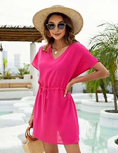 Fashion Design: Short bikini cover ups with sexy V Neck, short dolman sleeves, waist drawstring, small side split, flowy loose hem, above knee length and A-line design, simple basic style, easy to dress up and down.