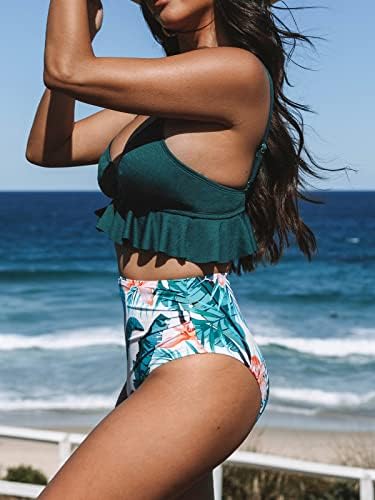 Design: Makes You Shine on the Beach in Our Retro Green Bikini Set with Adjustable Spaghetti Straps. Detailed with Triangle Top, Flowy Ruffle Hem, and High Waisted Floral Print Bottom Piece. About Cup Style: with Removable Pads
