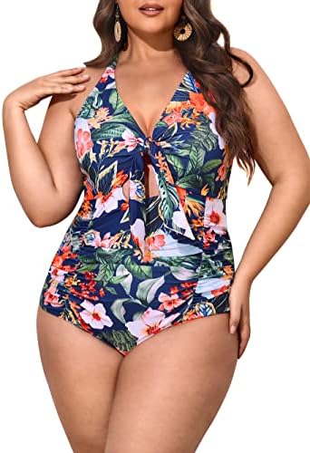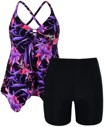 Tankini bathing suits for women plus size: This plus size swimwear includes tankini top and swim bottom. Flowy swimming top is long enough to cover your tummy, high waisted boyshorts provide comfy coverage, modest two piece swimsuit for women