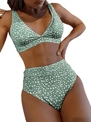 High waisted, v neck, floral print, two piece bathing suit