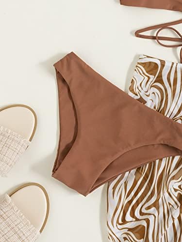 Solid high waist bikini bottom and allover print, drawstring front beach skirt