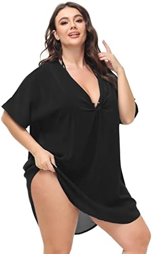ใ€Unique Designใ€‘Deep V-neck with loop design makes this plus size swimsuit cover up unique; Curved asymmetrical hem makes you sexy and hot; This sexy beach cover up is not too sheer but not too solid just right where canโ€™t see too much of your stomach but still make you look cute.
