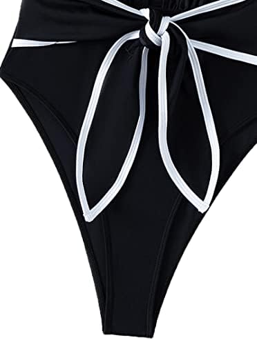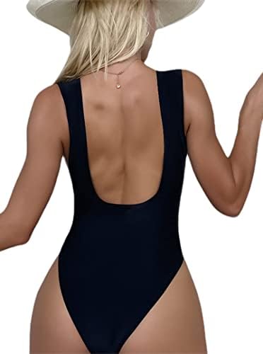 [FEATURES]: Swimsuit women one piece, plunging neckline, backless, self tie, solid color, contrast trim