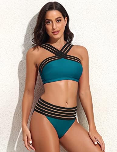 Two in one Bikini bathing suit for women, sexy front cross swim top with high waisted bikini bottom, high leg bikini with full coverage rear seat, flattering swim suit set without thinking about matchin