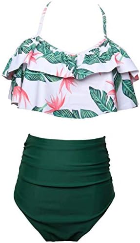 Little girl two pieces swimsuits with halter neck and adjustable drawstring closure. It designs stylish cute flounce crop ruffles tops and high waist bottoms with vivid printing pattens (polka dots,banana,leaves) that will make your girl more gorgeous