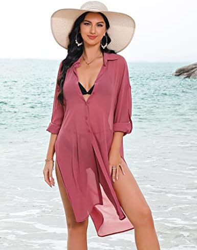 KOJOOIN Women’s Swimsuit Cover up Long Sleeve Button Down Sheer Cardigan