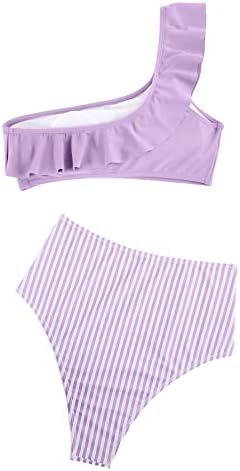 Feature: ruffle trim, one shoulder, solid bikini top, high waist, striped bikini bottom, 2 piece set