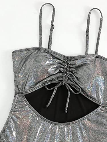 Feature: adjustable strap, drawstring ruched, cut-out, looks shiny, sparkly, one piece