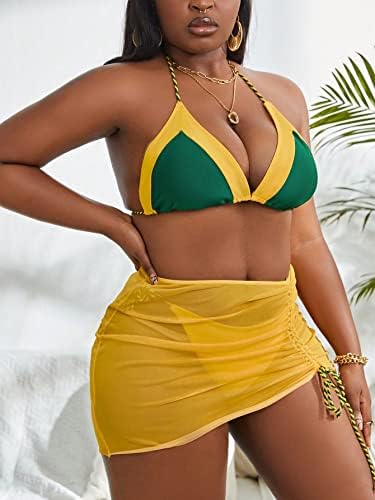 MakeMeChic Women’s Plus Size 3 Piece Swimsuit Sets Color Block Halter Triangle High Cut Bikini with Drawstring Beach Skirt