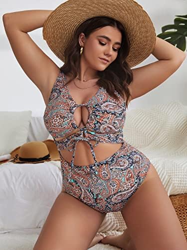MakeMeChic Women’s Plus Size Paisley Print Drawstring Cut Out One Piece Swimsuit Monokini Bathing Suit