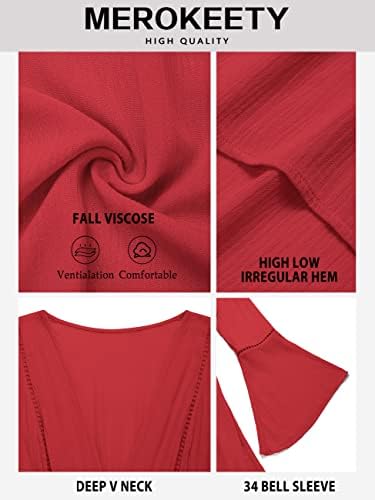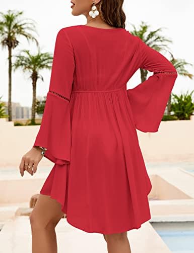 Feature: Deep v neck, 3/4 bell sleeve, loose-fitting, high low irregular hem, a-line beach dress, mini length, solid color, little crochet hollow out lines, patchwork design, back elastic waist.