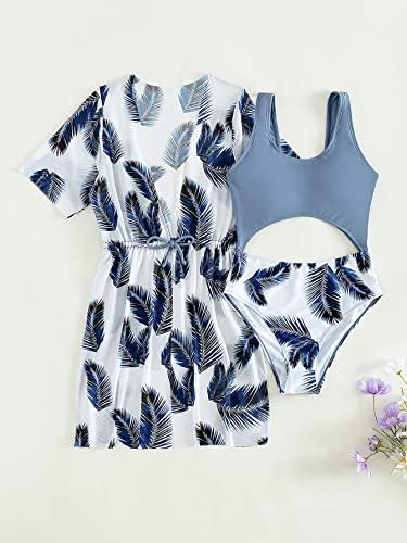 Milumia Girl’s 2 Piece Tropical Leaf Print Cut Out Swimsuit Bathing Suit with Kimono Coverup