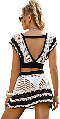 SheIn Women’s Crochet Hollow Out Cover Up Set Tie Front V Neck Beach Coverups Swimsuit