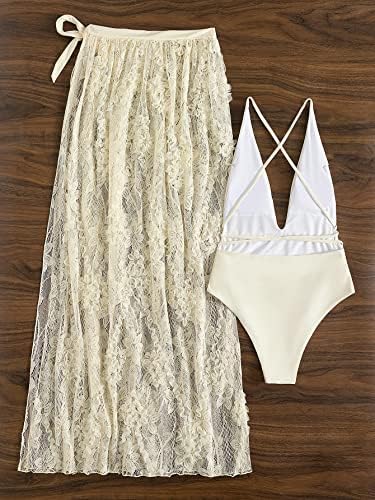 Features: monokini swimsuit and cover up skirt, plunging v neck, crisscross back, backless, spaghetti straps, sleeveless, tie back, high cut, floral tie maxi skirt