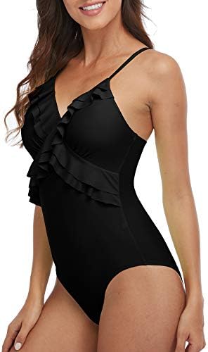 【Features and Designs】 Women V Neck Padded Criss Cross Front Ruffle Design One Piece Swimsuits; Adjustable Back Shoulder Straps Flounce Open Back One Piece Monokinis Swimwear Bathing Suits