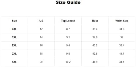 XX-Large Plus: Top Length: 9.4″, Bust: 40.2″, Waist Size: 39.4″,