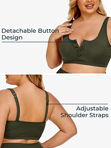 ใSPORTY CROP BIKINI TOPใThe plus size swimsuit has a sporty scoop neck crop bikini top with a removable soft bra pad and adjustable widening shoulder straps. Detachable buttons and a classic low-back design of this ribbed swimwear make you more attractive.