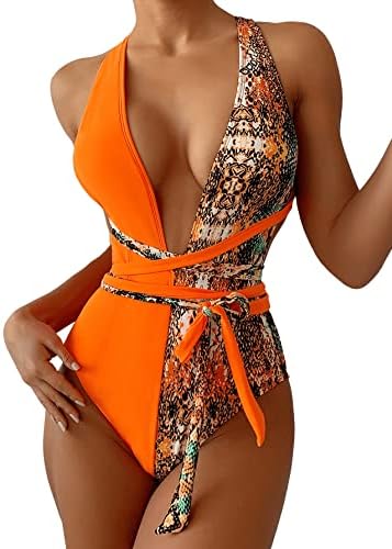 Features: Leopard, Deep V, Open Back, Monokini Swimsuits for Women.