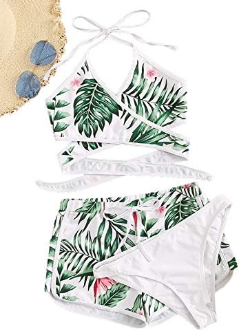 SweatyRocks Women’s Three Piece Swimsuit Leaf Print Wrap Halter Top with Shorts Bikini Set