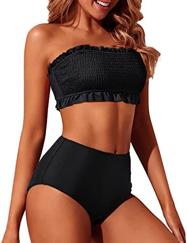 Black two piece swimsuit with a strapless shirred swim top is suitable for tropical vacations, summers, beaches, swimming pools, honeymoons and any other water occasions.