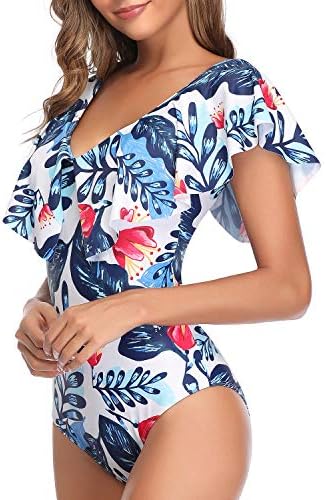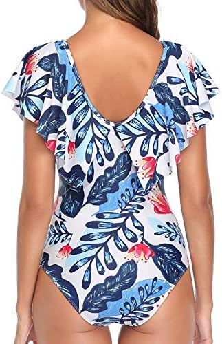 The deep V-neck matched with the V-back design gives a sexy style to this cap-sleeve one-piece ruffle bathing suit. It provides modest coverage and hides the imperfections you don’t prefer to show.