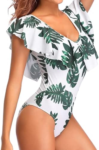 The deep V-neck matched with the V-back design gives a sexy style to this cap-sleeve one-piece ruffle bathing suit. It provides modest coverage and hides the imperfections you don’t prefer to show.