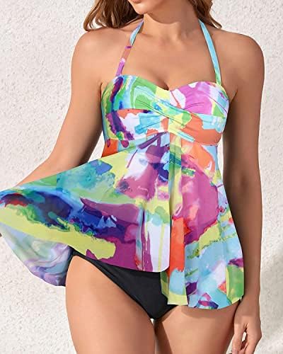 2 Piece Tankini Swimsuits: Flyaway tankini top paired with mid-rise bikini bottoms. Two ways of wearing. The straps can be transformed into a halter style or a bandeau strapless look.