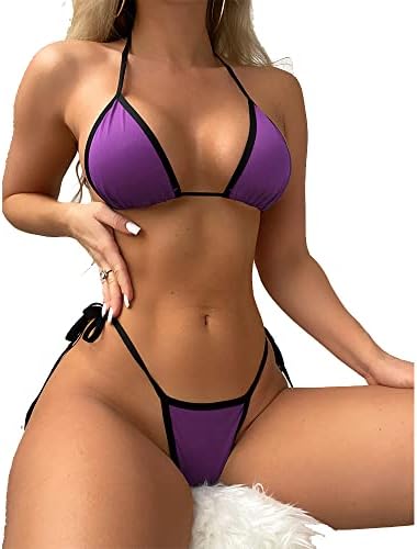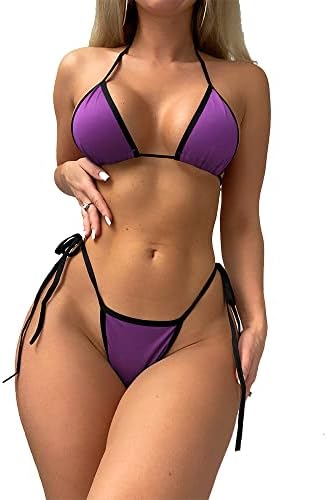Triangle Bikini Swimsuit Contrast Binding Micro Halter String with Thong Two Pieces Sexy Swimwear(S Size)