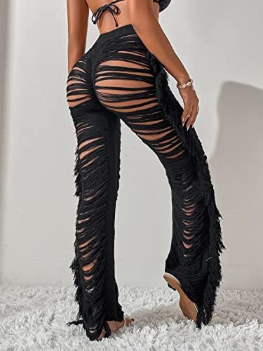 Features: high waist, ripped hole, fringe, semi sheer, knitted long pants