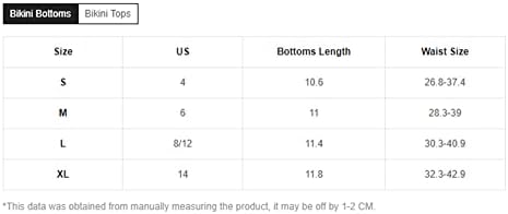 Small: Bust: 28.0″, Top Length: 16.7/3.7″, Waist Size: 23.6-37.4″, Bottoms Length: 10.6″, Waist Size: 26.8-37.4″