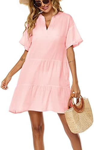 Perfect Design: Women’s bathing suits cover ups featuring Sexy V neck/basic short sleeve/tiered ruffle dress/cute babydoll mini short beach dresses/pleated swing dresses/A-line swim cover up beach dress/above-knee length/pockets both sides.Casual Loose beach bikinis swimsuits coverups also can wear as flowy casual summer dresses, which is necessary for your wonderful beach vacation