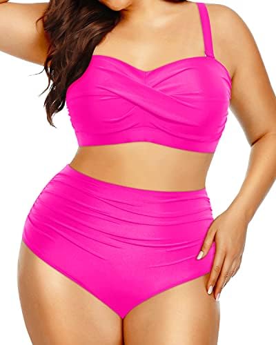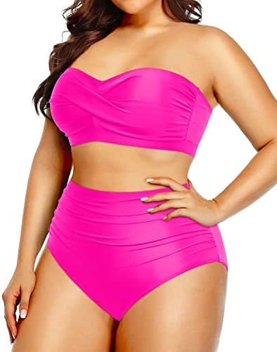 Plus Size Two Piece Bathing Suits: Two piece plus size swimsuit for women features twist-front bandeau bikini top and high waist bikini bottom to make you look cute and flattering.