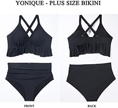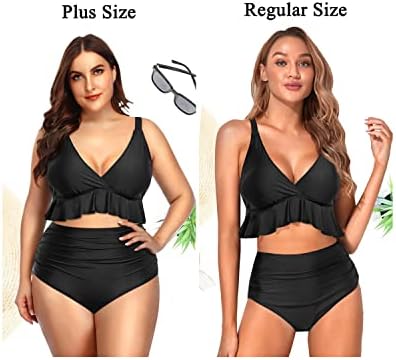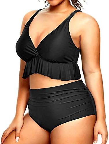 Plus Size Bathing Suits for Women Two Piece: 2 piece plus size swimsuit for women features flounce bikini top and high waisted bikini bottom, looks cute and flattering.
